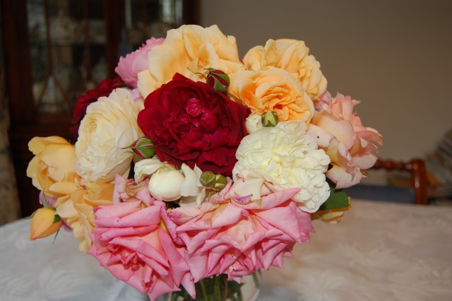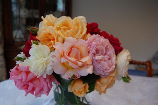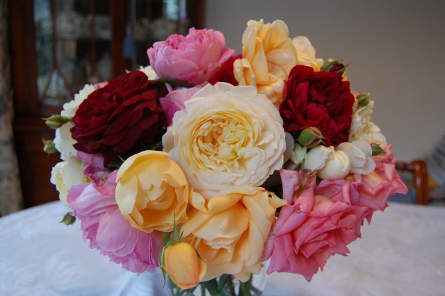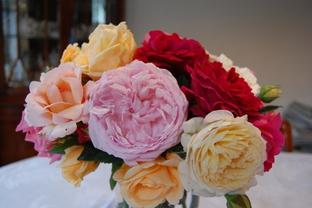 My roses dislike the rain even more than the chickens, bees or I, do. They ball and rot, and their branches bend to the ground with the weight of water on their delicate blooms. Then the sun pops out and scorches those that haven't succumbed to botrytis. Today I decided to rob the rain of its spoils, and cut the roses that were in bloom so that I could enjoy them for a day or two longer. Their colour and fragrance overwhelms me as I bury my face in them; the touch of their velvety petals on my skin is like silk and cashmere rolled into one. Opulent and luxurious, and comforting . It felt mean to keep them secret, and hog them all to myself so here I am sharing them with you.