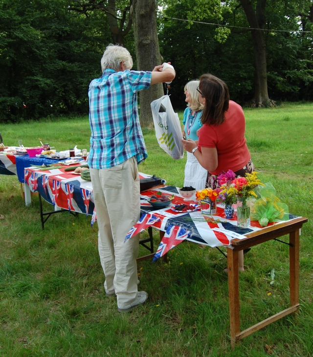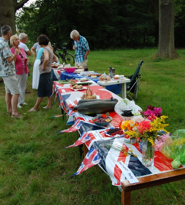 I packed the basket on my trust ancient Dawes bike, a relic from the 1970s, with a blanket, the scones, jam and cream, and some fruit juice, and Kevin and I cycled the mile into the village, and found the rest of the party goers. Allotmenteers from both the allotment sites in the village were there, the original Vicarage Hill site where I have mine, and 20 new allotments that had been created this year at Dilly Lane.