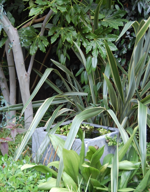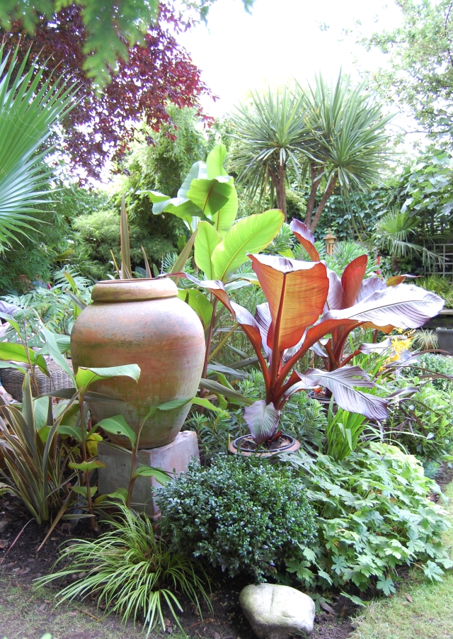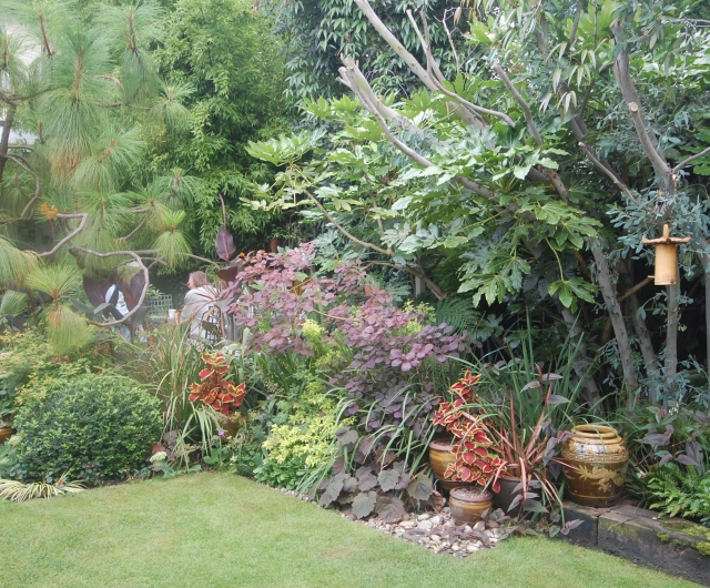 I grew up in the Far East, jungles and plantations were part of my life, and the minute I walked out of the alley alongside the house into the garden, the atmosphere instantly took me back to my childhood. The sense of enclosure and verdancy had me in mind of the wild areas I used to play in as a child alongside my Arma's kampong. The screeches and flashes of lime green of the now endemic Parakeets simply added to the atmosphere. Bamboos and large bold cannas,, fatsias, figs, ferns, phormiums, all provided a tapestry of leaves reminiscent of far away places. Foliage texture and colour is a very important part of this garden. Many of the plants such as the tree ferns, the huge magnolia and the pine give an air of permanence. Dinosaurs could have been here before me.
